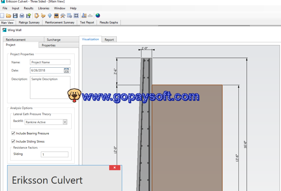 Eriksson Culvert 是最先进的预制和现浇箱涵工程软件,将最先进的结构分析引擎的功能与全自动设计和分析功能无缝结合。将关键设计任务集成到一个系统中意味着您可以通过改进的质量控制获得卓越的生产力和灵活性。在自动设计模式下,Eriksson Culvert 可以快速分析和设计壁厚、钢筋尺寸和间距。生成包含钢筋和钢筋网的综合钢筋明细表,包括所有钢筋尺寸和折弯。支持 LRFD、标准、AREMA 和 CHBDC 规范,以及美国习惯单位和公制单位。高度图形化的用户界面提供了多个视图来呈现设计并呈现结果。提供了设计的完整细节以及详细的计算。强大的图形以真正的 3D 方式显示所有钢筋,并且用户可定制的卡车库包含在复杂的活载功能中。