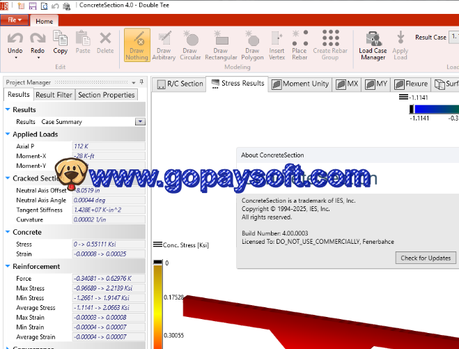ConcreteSection将帮助您设计复杂的钢筋混凝土型材。ConcreteSection将处理建模细节,同时指定钢筋的位置和尺寸。该软件将分析您的混凝土模型,以确定 3D 相互作用图、混凝土应力和应变以及钢筋应力。ConcreteSection还通过根据施加的荷载和相互作用面计算弯矩统一值,使用ACI或CSA强度折减系数执行设计检查。