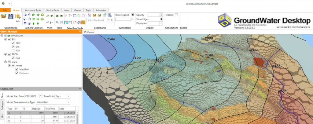 GroundWater Desktop 是一款面向地下水建模师、环境工程师和水文地质学家的三维 Windows 应用程序。它允许对地质/水文地质数据(如水位、污染物浓度、井岩性)以及流动和输运模型结果进行可视化和分析。该应用程序支持与 MODFLOW、MT3D、MODPATH 等模型的工作交互,以及带有非结构化网格(MODFLOW-USG)的版本。支持地理空间数据:导入栅格、形状文件、正射照片,并可叠加建筑物和其他物体。地统计方法已内置:例如基于浓度数据的三维克里金技术、污染物同位面的构建、污染物泄漏的体积和质量计算。