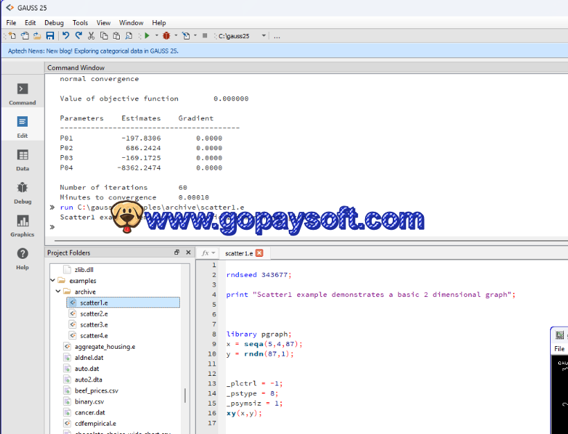 Aptech Systems GAUSS 是一款商业软件环境和编程语言,由 Aptech Systems Inc. 开发,用于数值计算、统计学、计量经济学和数据分析,用于解决复杂的数学和分析问题。GAUSS最初是为计量经济学问题(时间序列、预测、GARCH模型、面板数据等)而创建的。虽然R/Python中也有类似功能,但在GAUSS中,这些功能内置于核心中,并针对数据分析任务进行了优化。与解释型语言(如没有优化库的R或Python)相比,GAUSS在纯数值计算中可以显著更快。GAUSS包括:回归函数、平稳性检验、时间序列、优化、统计估计等。
